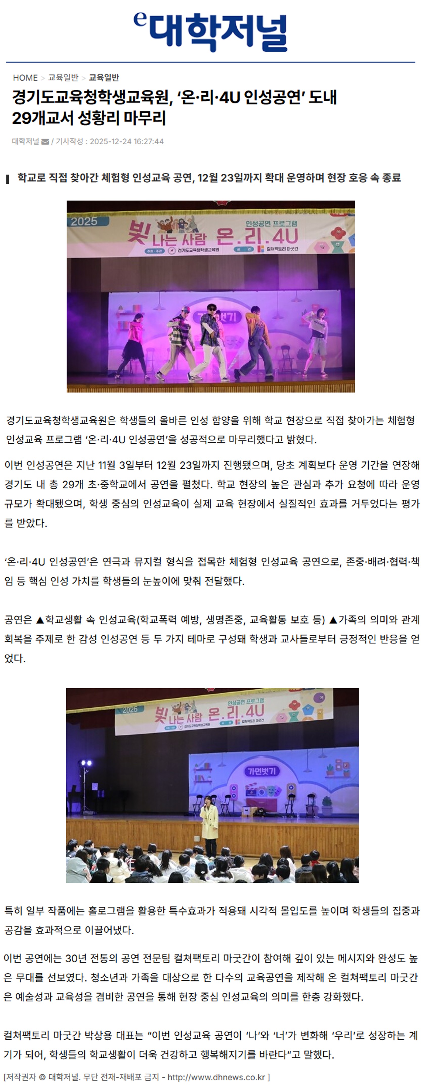 [´ëÇÐÀú³Î] °æ±âµµ±³À°Ã»Çлý±³À°¿ø, ¡®¿Â¡¤¸®¡¤4U Àμº°ø¿¬¡¯ µµ³» 29°³±³¼­ ¼ºÈ²¸® ¸¶¹«¸®